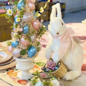 Coelho Decorativo com Cesta/Laço e Folhas cor Branco/Rosa/Verde (Doce Vício)