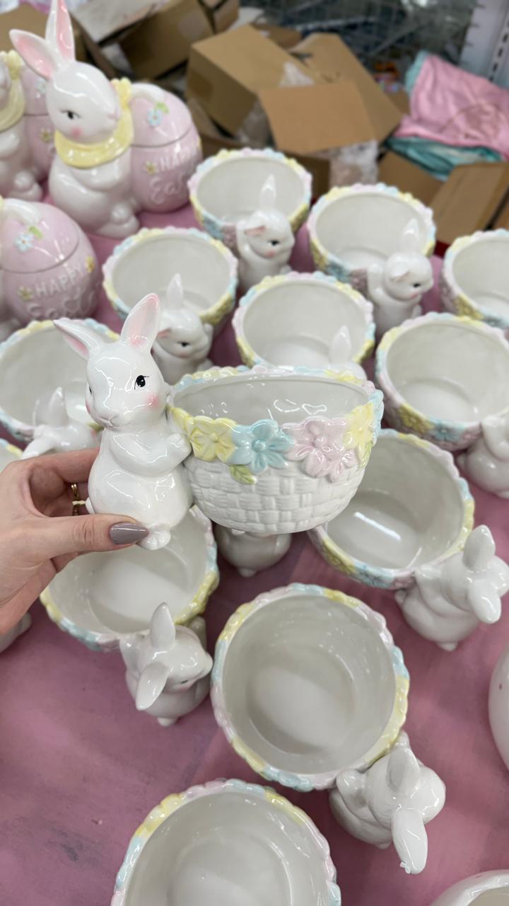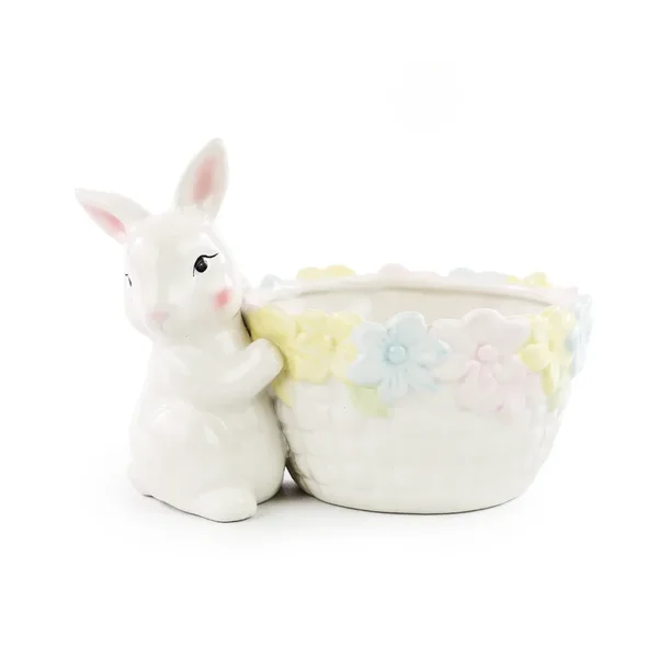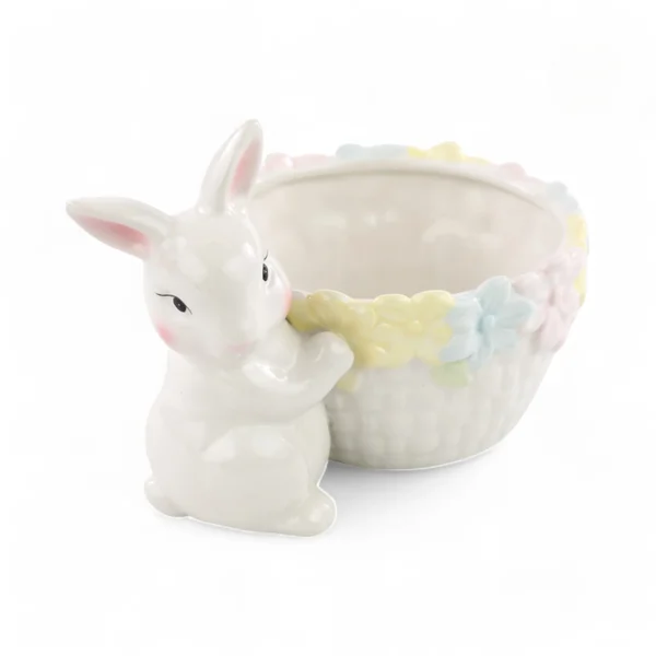 Coelho decorativo em cerâmica com cesta em formato de bowl, com acabamento delicado e detalhes florais em cores suaves.