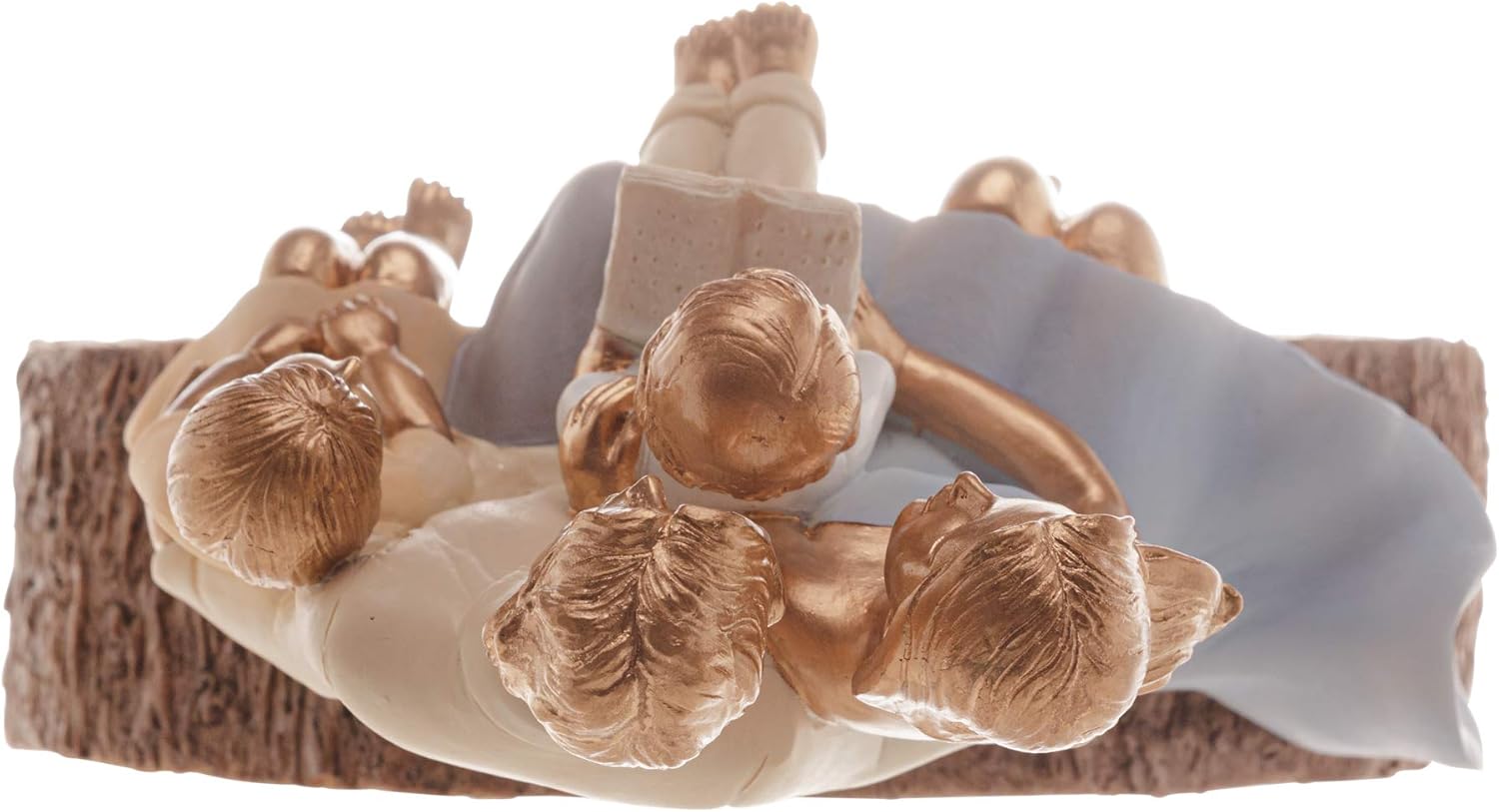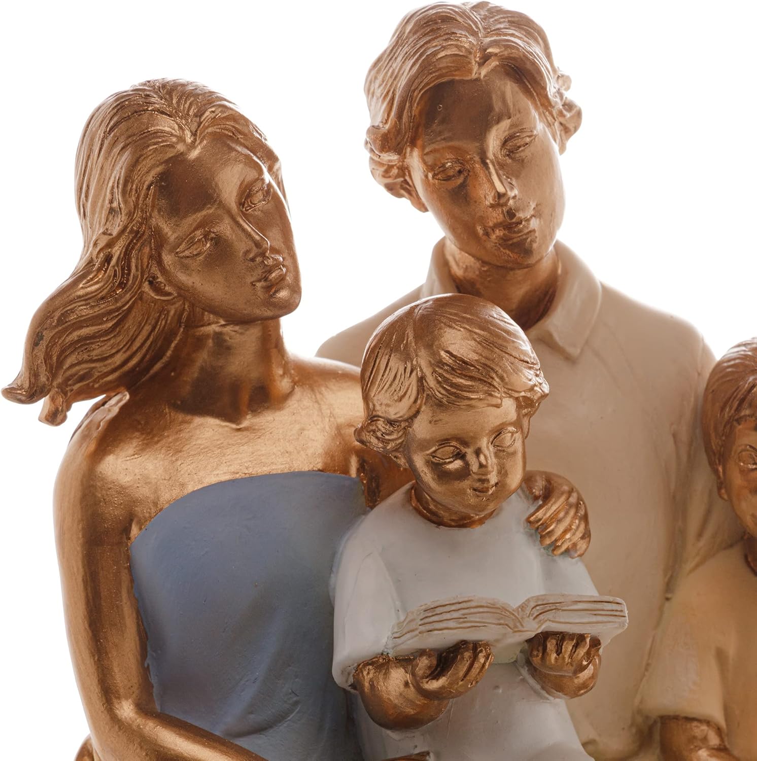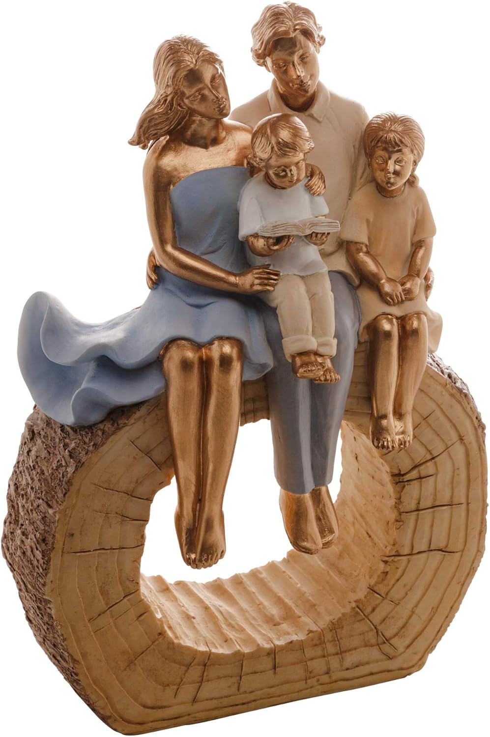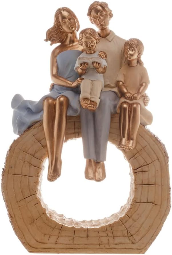 A escultura apresenta uma família sentada sobre uma base em formato de tronco, com textura que remete à madeira natural, transmitindo aconchego e harmonia. Os detalhes das roupas em azul e bege, aliados ao brilho sutil do dourado, conferem elegância e sofisticação à composição, tornando-a uma peça de destaque na decoração.