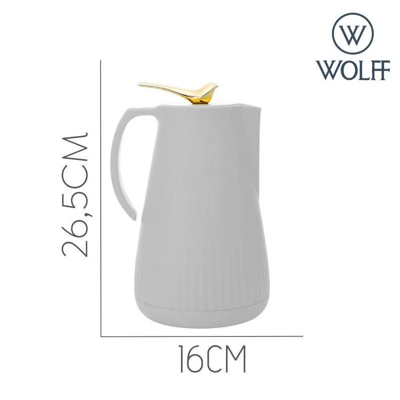 O acabamento branco confere um visual clean e refinado, ideal para compor mesas e ambientes com estilo. O destaque fica por conta do pássaro dourado sobre a tampa, um toque delicado e encantador que traduz o bom gosto e a atenção aos detalhes característicos da Wolff. A alça ergonômica e a tampa com vedação eficiente proporcionam conforto, segurança e praticidade no uso.