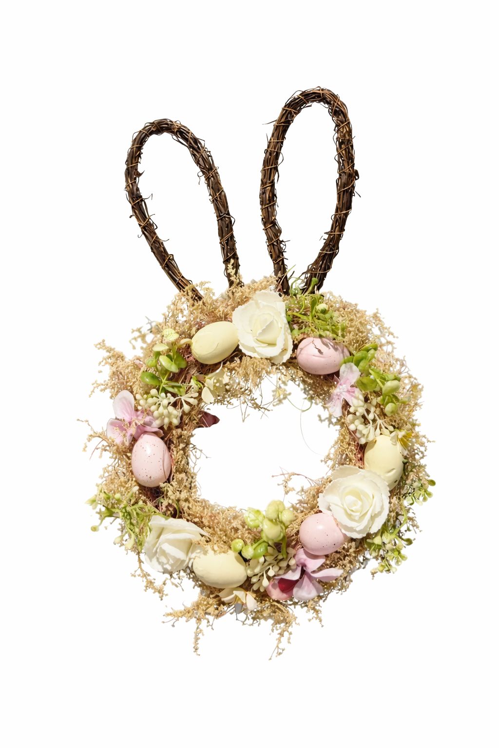 Encantadora e delicada, essa guirlanda é perfeita para trazer o clima da Páscoa para a sua decoração. Com base rústica e orelhinhas de coelho em galhos naturais, ela combina elementos florais e ovos decorativos em tons suaves, criando um visual harmonioso e cheio de charme.