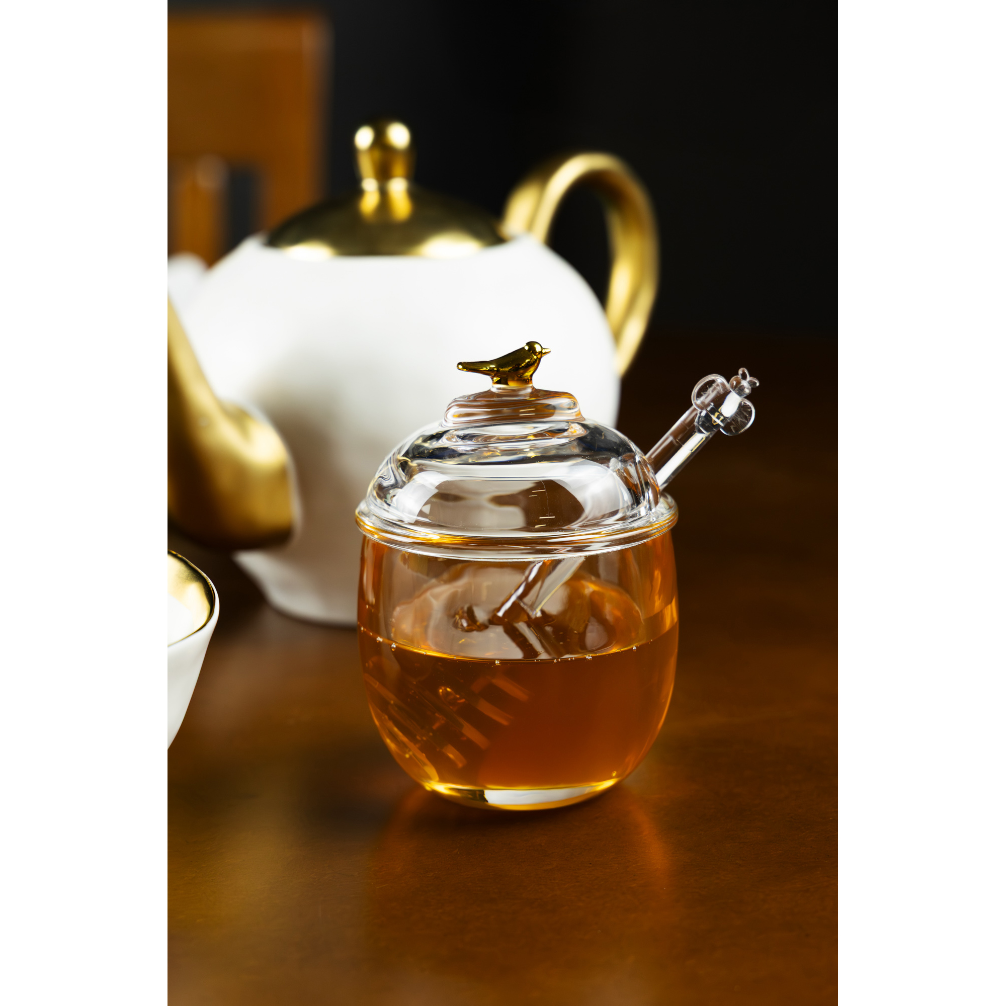 Com design inspirado na linha Golden Bird, a meleira apresenta ilustrações sutis de pássaros na tampa com acabamento dourado, acompanhada de um pegador decorativo. A colher possui uma delicada abelha em alto relevo, reforçando o charme da peça e sua conexão com o mel, tornando o servir ainda mais elegante e detalhado.
